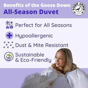 DOWN UNDER BEDDING brings to you a duvet for every season! This specialized duvet provides extra comfort for any climate. Made with a top-quality 289 thread count 100% cotton outer shell that is durable, soft, and breathable. The filling is made from 100% goose down.