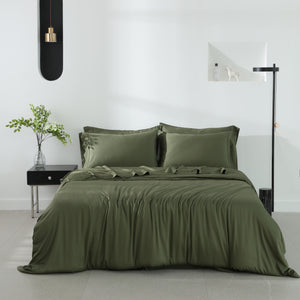 The fabric is silky smooth and drapes nicely over my California King mattress. There are 4 corner ties to hold the duvet in place. I have been looking forever for a duvet and duvet cover that ACTUALLY fits my bed and this is perfect! Thank you!!